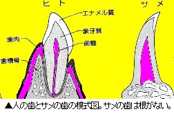 これがヒトの歯との大きな違いだ。ちなみに進化の過程で爬虫類までの動物には,歯の根が存在しない。